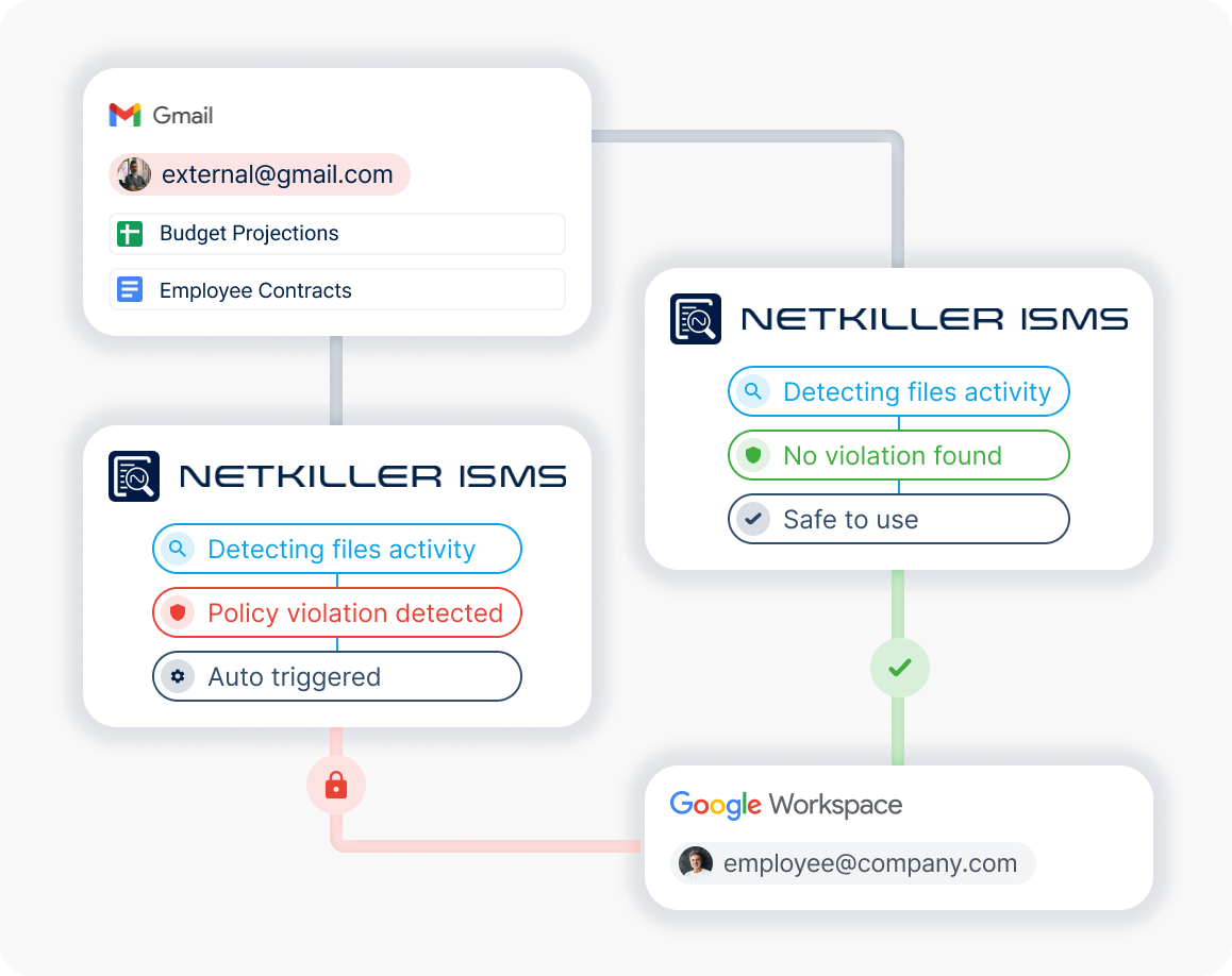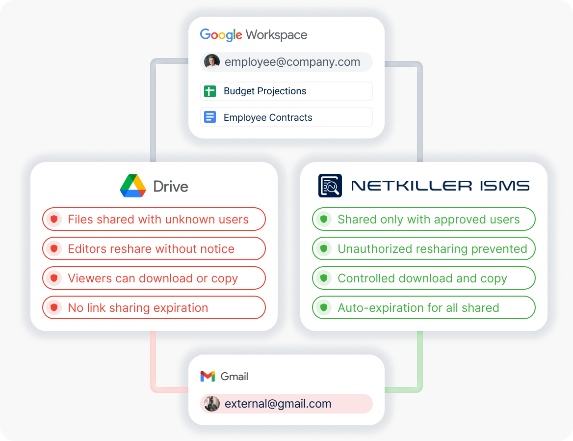 Netkiller ISMS is the definitive way to prevent data leaks by flawlessly implementing security policies, without hindering Google Drive collaboration.