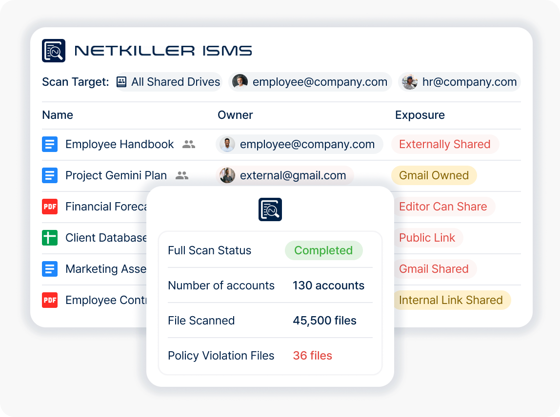 Netkiller ISMS safeguards your organization’s Drive by controlling external sharing, blocking risky content exposure, and monitoring file activity in real time, keeping your data private, secure, and compliant.