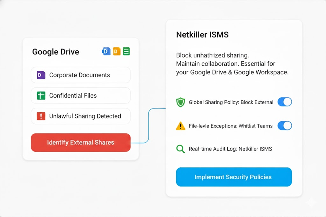 Netkiller ISMS is the definitive way to prevent data leaks by flawlessly implementing security policies—without hindering Google Drive collaboration.
