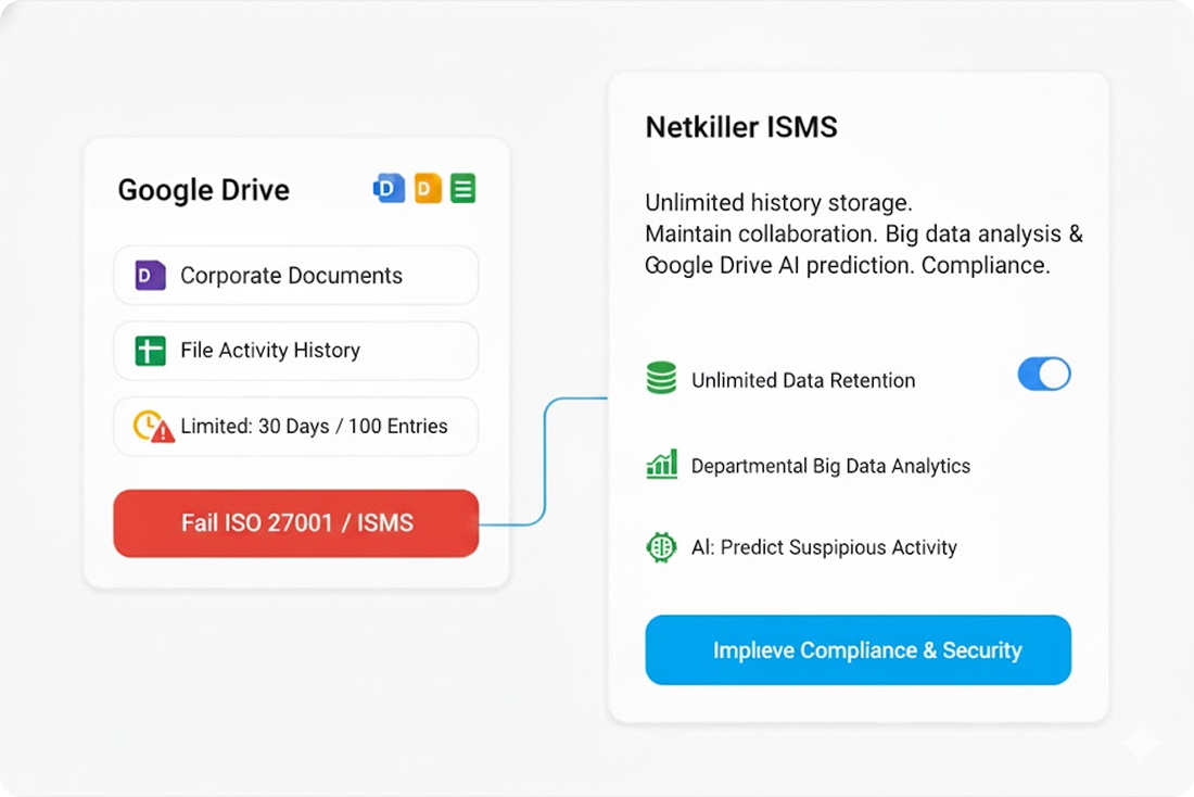 Netkiller ISMS eliminates the security blind spots overlooked by Google’s default protection. With its 3-Stage Complete Security Framework — Real-Time Detection, Sharing Approval, and Full Scan — combined with automated policies, it delivers the most powerful and flexible security solution built for the era of AI-driven collaboration.