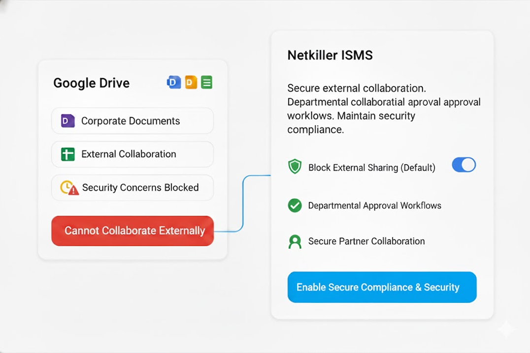 Solution : Netkiller ISMS enforces approval for external sharing, applies auto-expiration, disables download/copy, and prevents resharing, closing every security loophole.