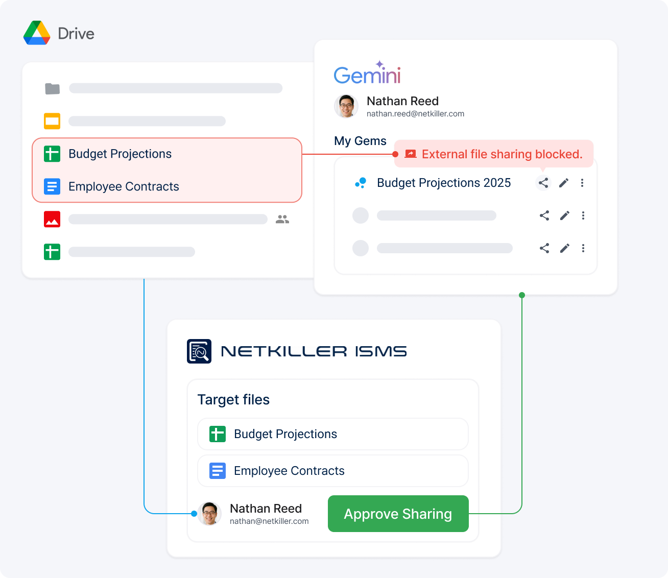 Unapproved Drive files and AI ‘knowledge files’ are blocked immediately, while approved shares are safely managed with set durations and permissions, leaving no uncontrolled links behind.